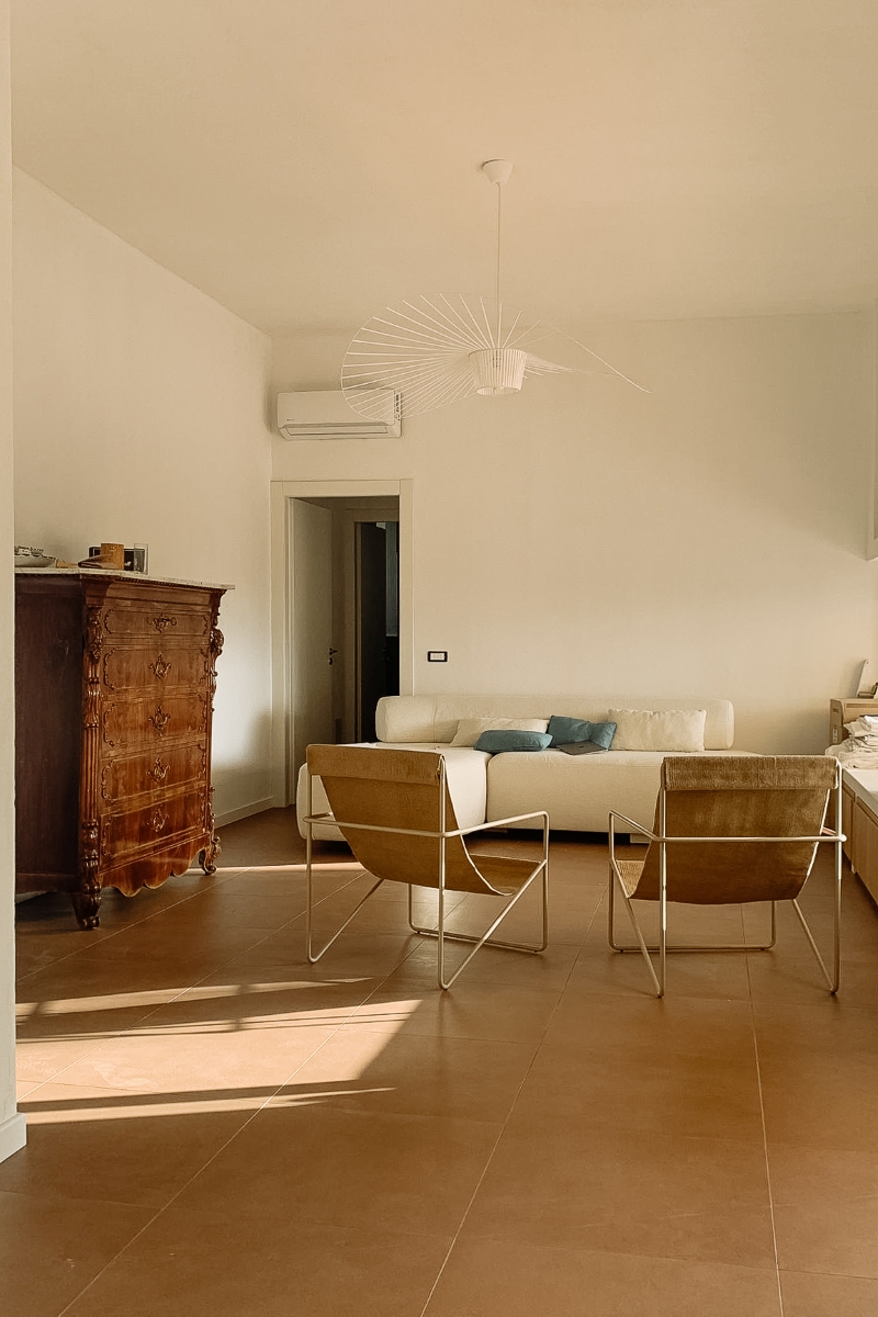Il patio svelato. Un patio interno tra i volumi della casa, luogo segreto, prima in assoluto non visibile, ma con una luce bellissima che lo penetra. L’apertura di una porzione muraria, una superficie vetrata, che contribuisce ad apportare luce all’interno del soggiorno, ampiandone la sensazione di proporzioni e lasciando intravvedere una realtà altrimenti nascosta.