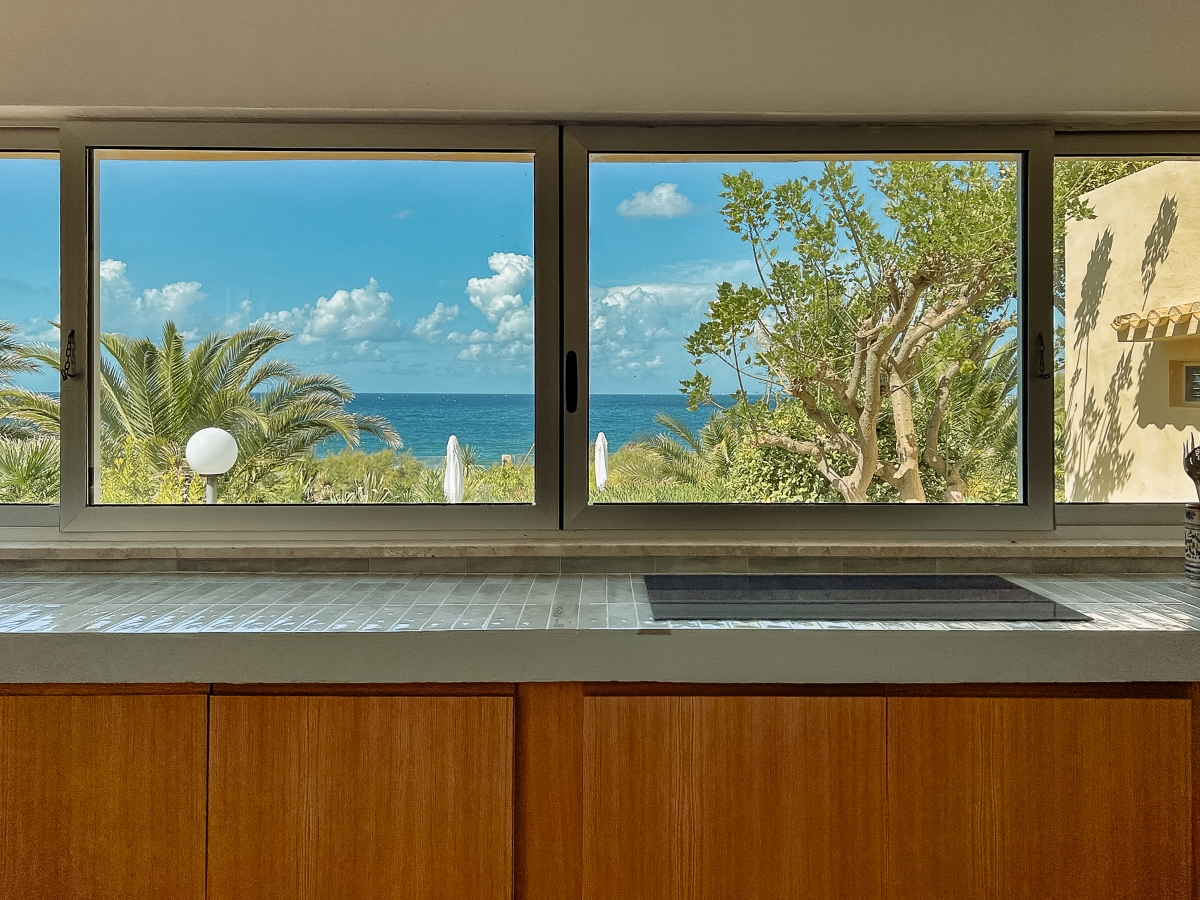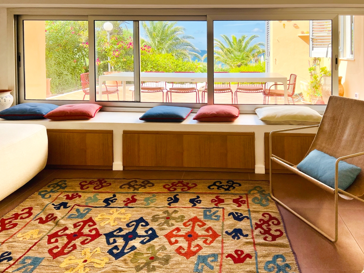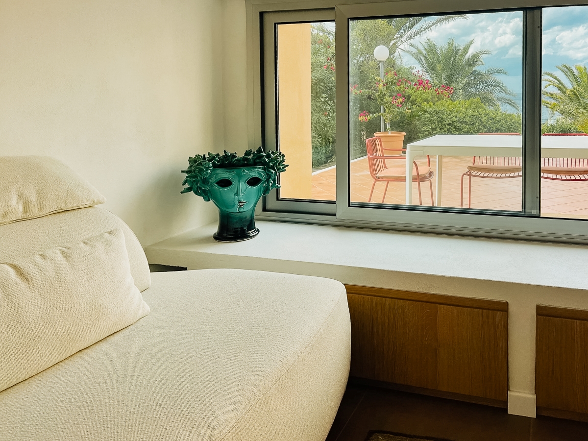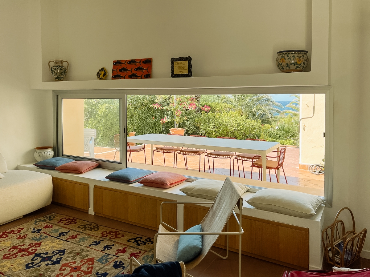 La finestra arredata. Una grande finestra orizzontale , fino ad altezza panca, collegamento tra la zona soggiorno interna e la “stanza all’aperto” immaginata nella terrazza. Una panca, appunto arredata, che continua in muratura nell’ambiente esterno, arricchita da cuscini, che rendono più confortevole la seduta