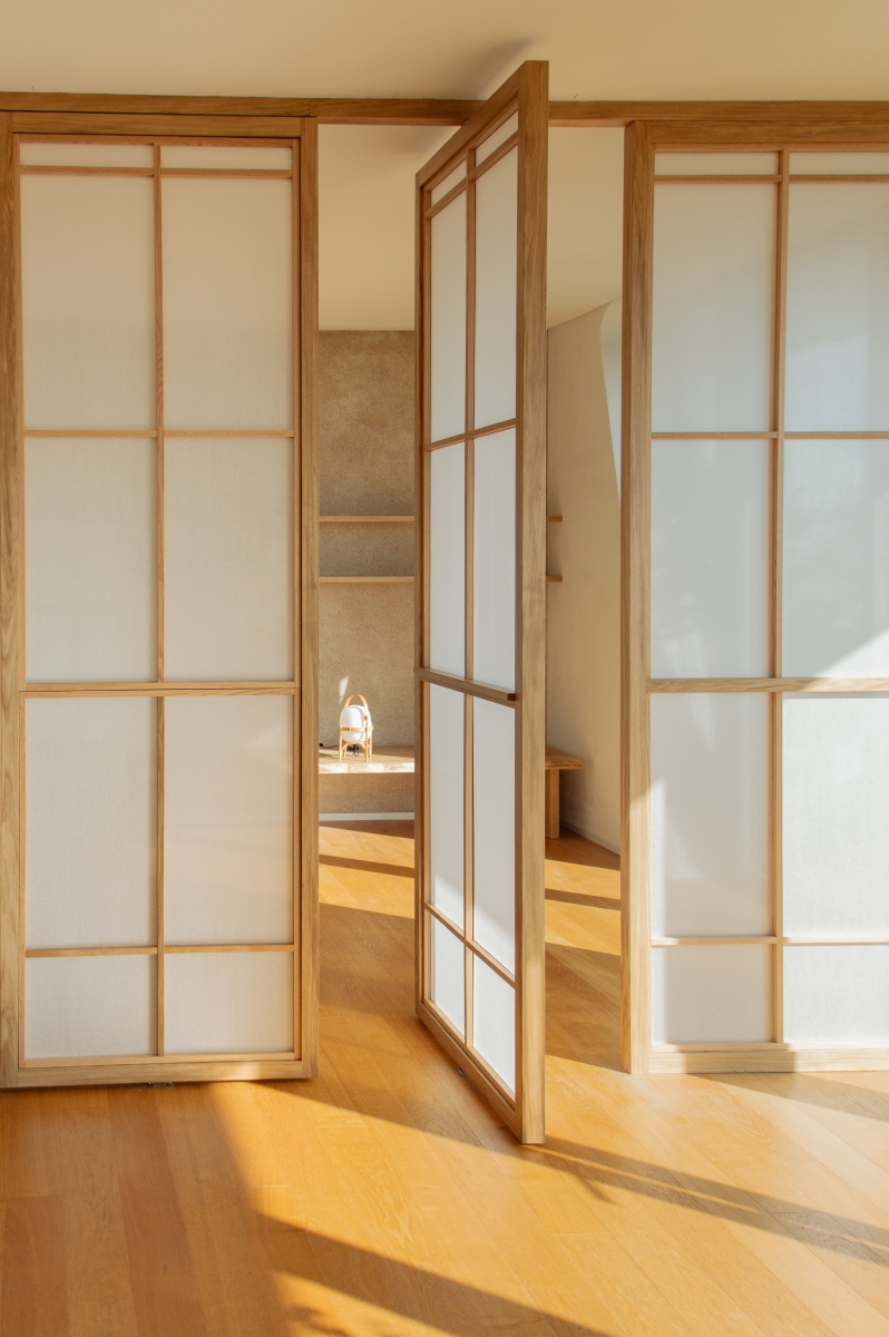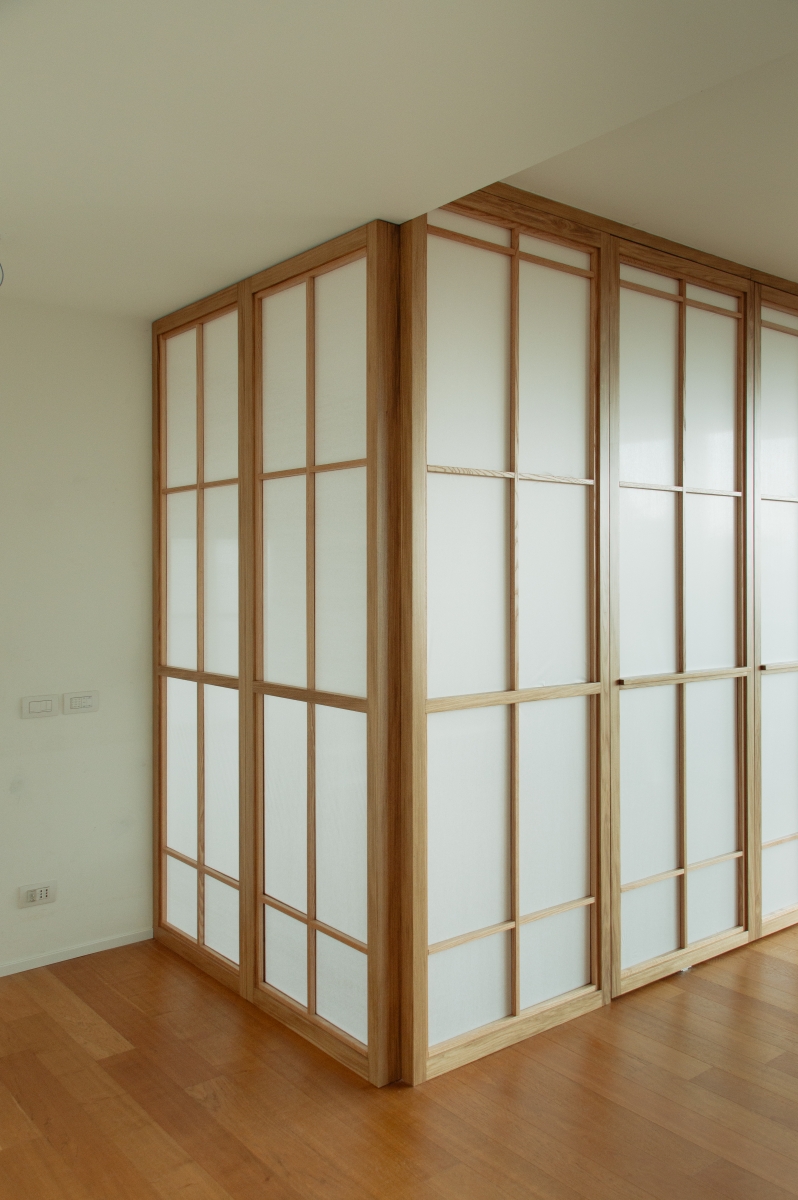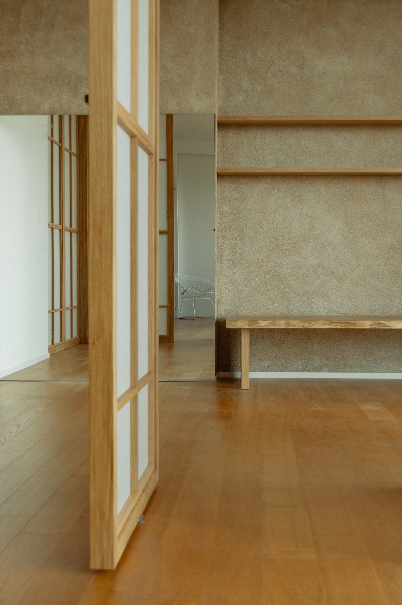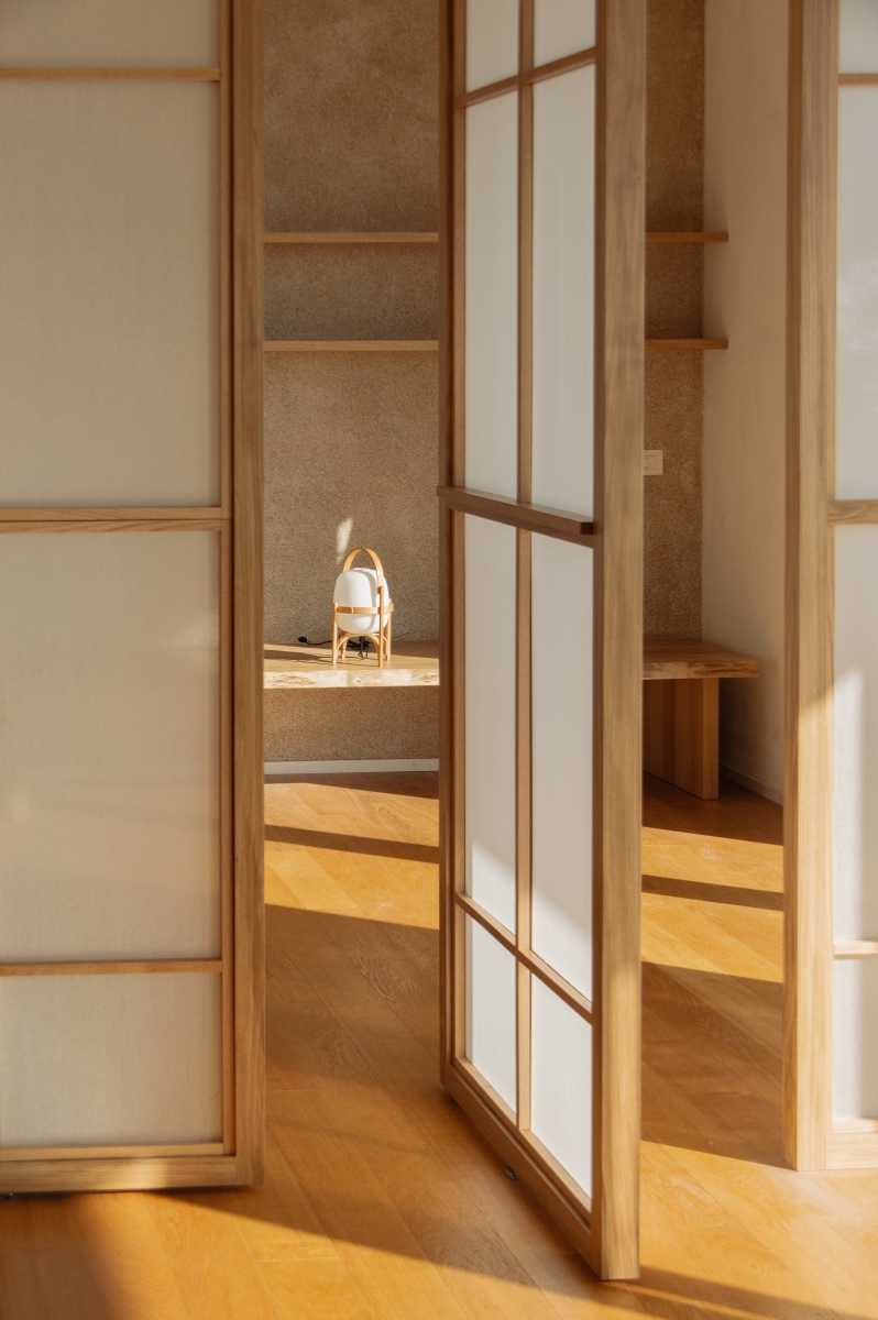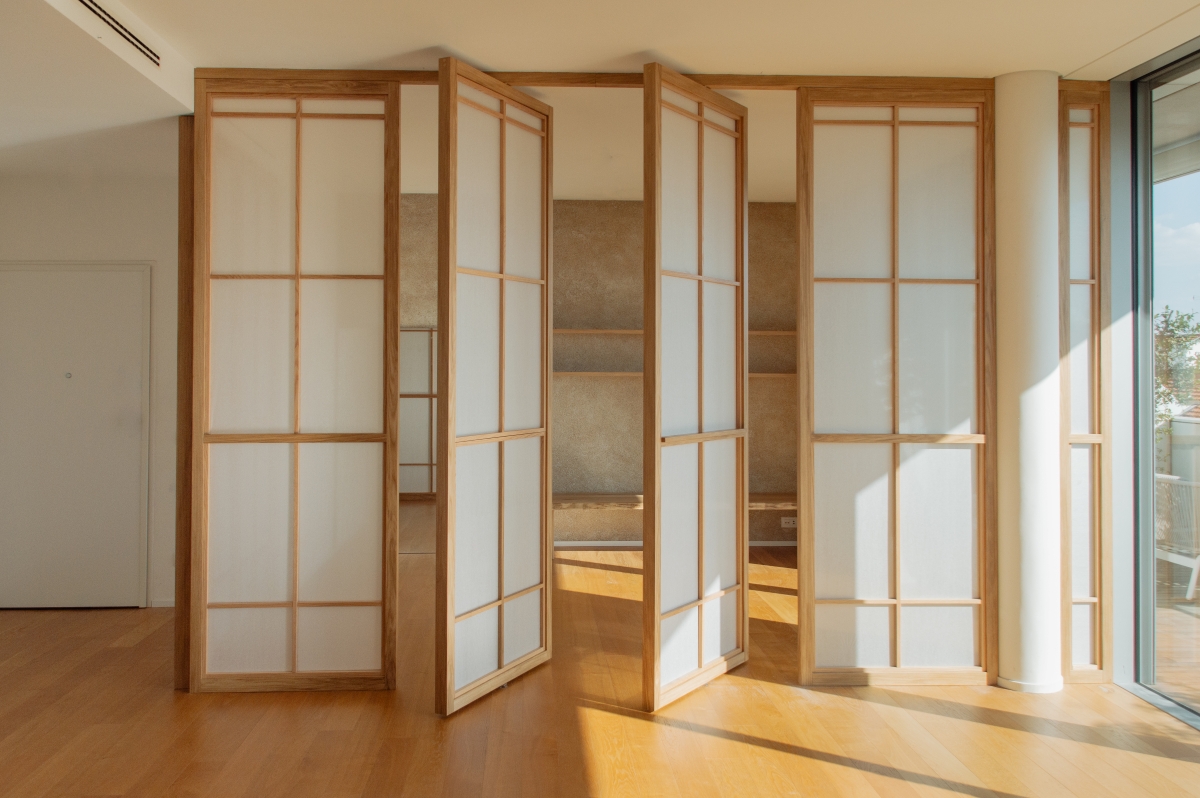 Uno spazio yoga e meditazione privato all’interno di un appartamento milanese, definito da pannelli fissi e rotanti in legno di rovere e carta, ispirati alla tradizione orientale, che creano ambienti flessibili e accoglienti. L’uso di materiali naturali come legno, carta e sughero per il rivestimento della parete di sfondo contribuisce a generare un’atmosfera calda e armoniosa, pensata per favorire il benessere personale nella vita quotidiana.