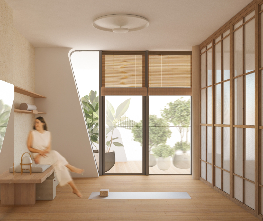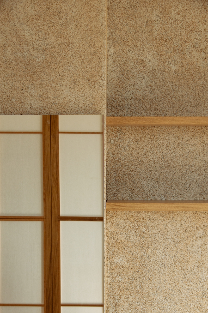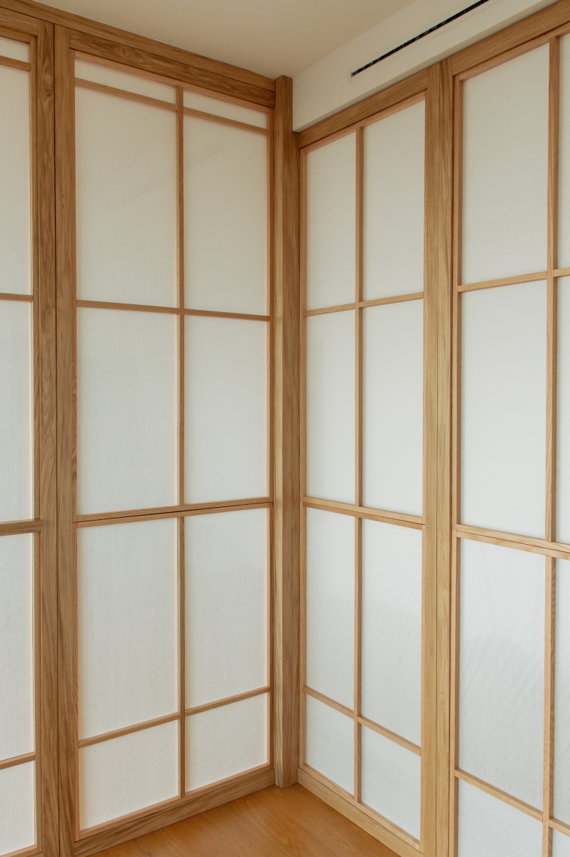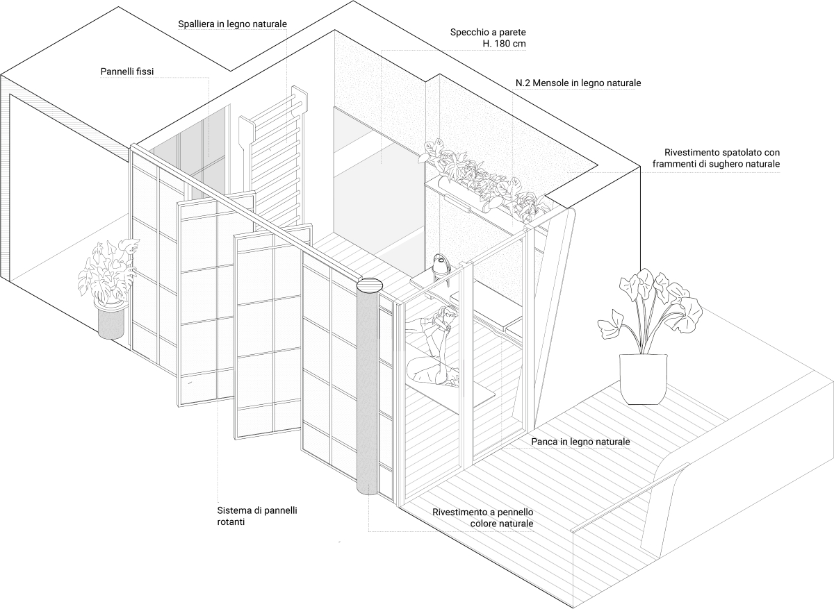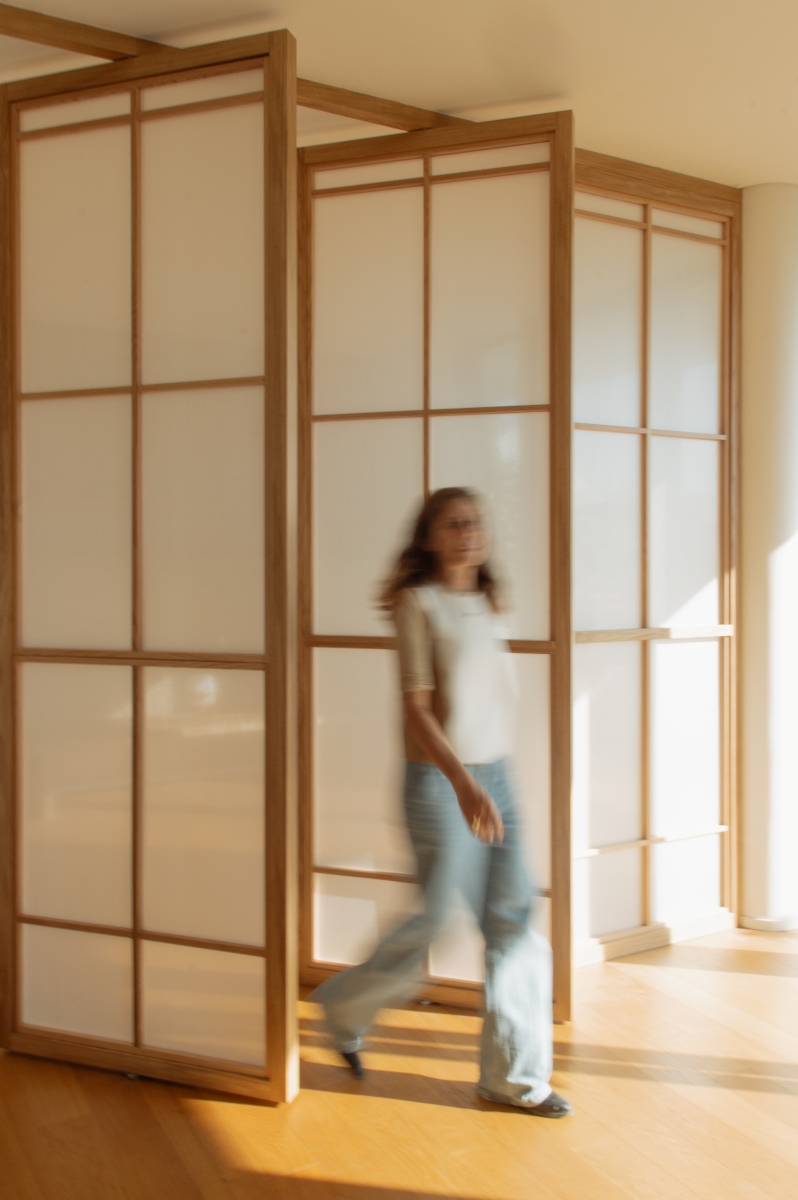 Uno spazio yoga e meditazione privato all’interno di un appartamento milanese, definito da pannelli fissi e rotanti in legno di rovere e carta, ispirati alla tradizione orientale, che creano ambienti flessibili e accoglienti. L’uso di materiali naturali come legno, carta e sughero per il rivestimento della parete di sfondo contribuisce a generare un’atmosfera calda e armoniosa, pensata per favorire il benessere personale nella vita quotidiana.