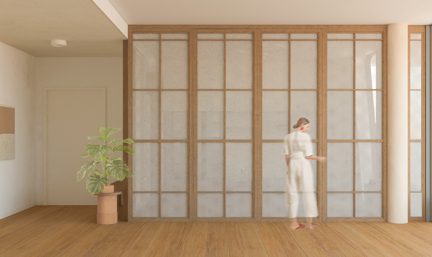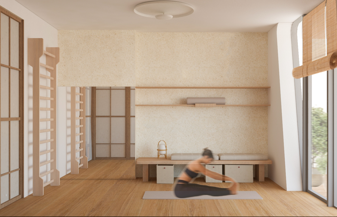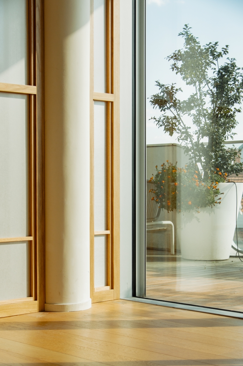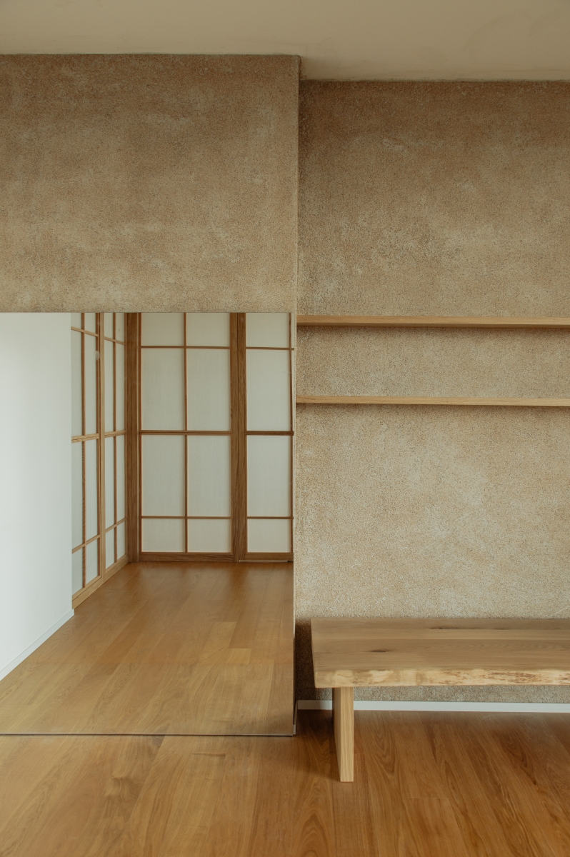 Uno spazio yoga e meditazione privato all’interno di un appartamento milanese, definito da pannelli fissi e rotanti in legno di rovere e carta, ispirati alla tradizione orientale, che creano ambienti flessibili e accoglienti. L’uso di materiali naturali come legno, carta e sughero per il rivestimento della parete di sfondo contribuisce a generare un’atmosfera calda e armoniosa, pensata per favorire il benessere personale nella vita quotidiana.