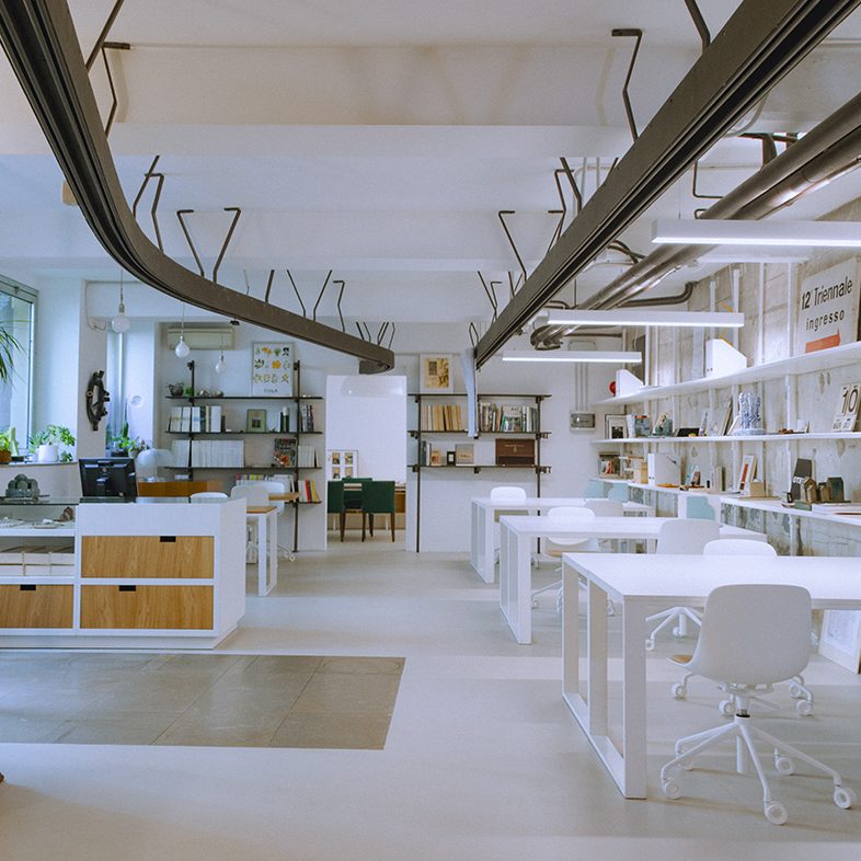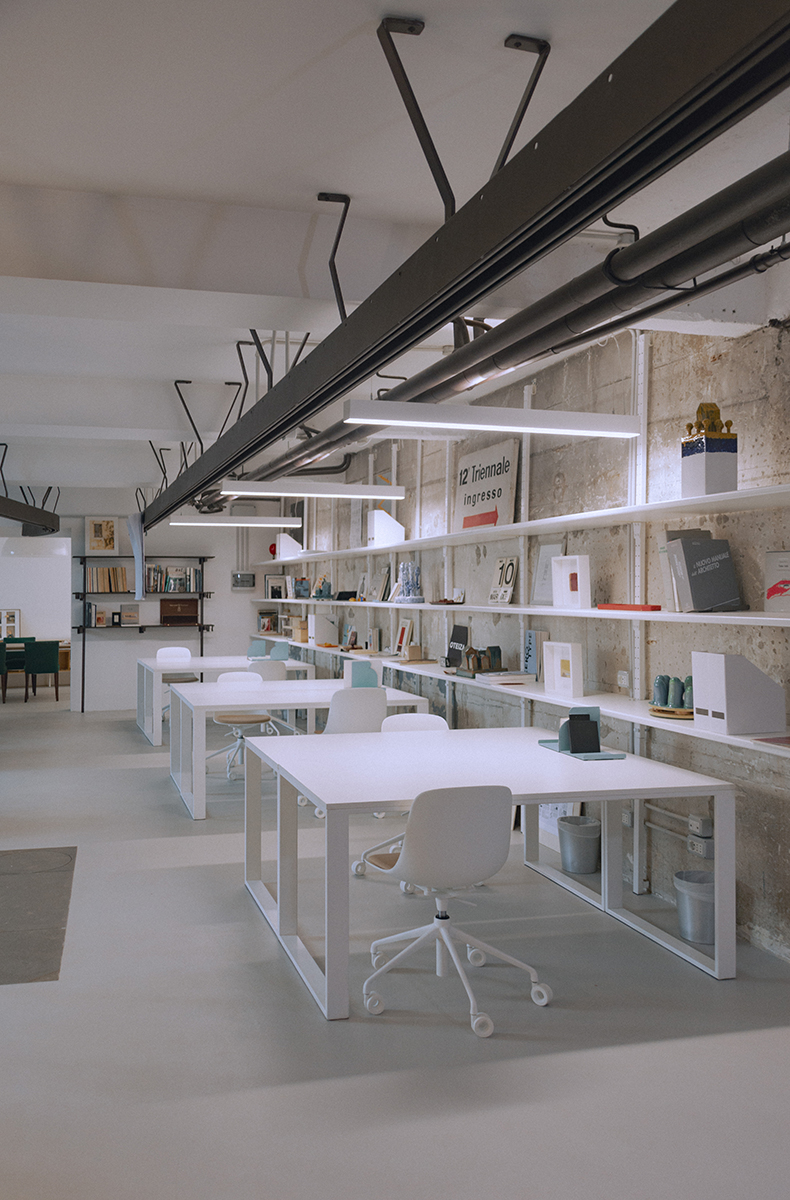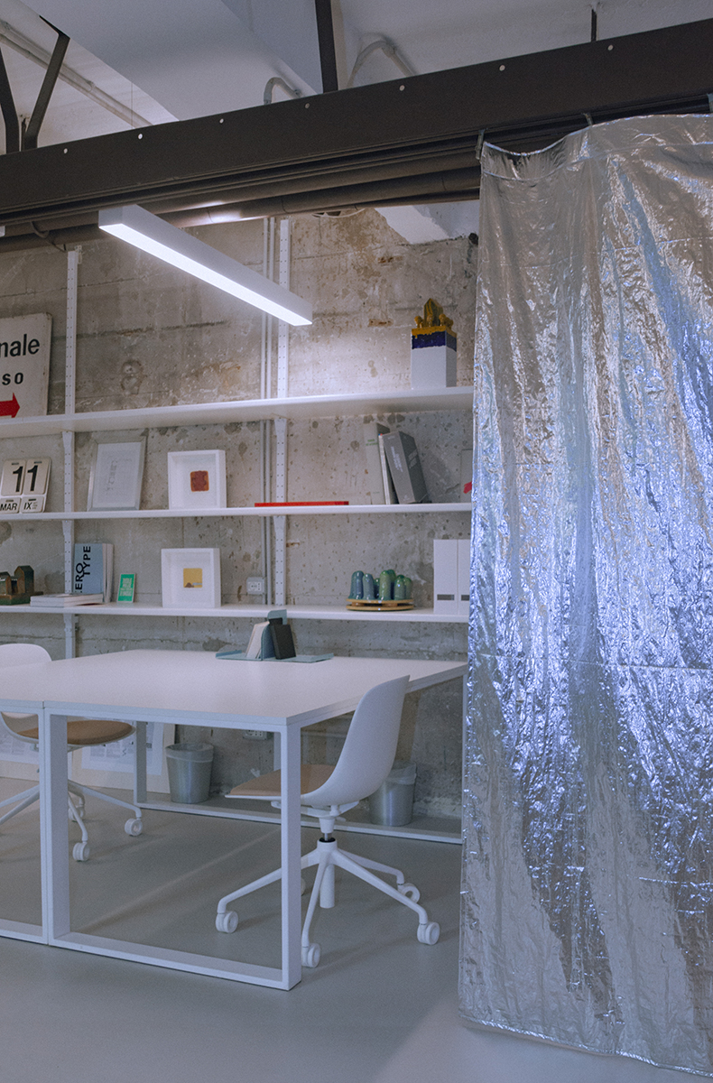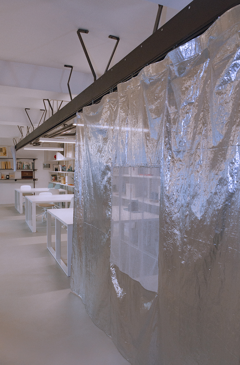 Lo spazio si trova all’interno di un cortile silenzioso, ma di in un’importante Via commerciale. Abbiamo voluto conservare un sistema di guide metalliche a doppio binario ancorate al plafone, pensate per questo luogo tanti anni fa, per uno spazio commerciale disegnato da noi. Un elemento fortemente caratterizzante, che ci consente di inserire delle tende filtro, posizionabili a seconda delle esigenze, appendere pannelli, immaginare un supporto per possibili mostre. Le scrivanie sono tavoli, anch’essi liberi di trovare nuove configurazione, tali da potersi unire, creando un unico tavolo lunghissimo o appaiare, costituendo isole di lavoro.