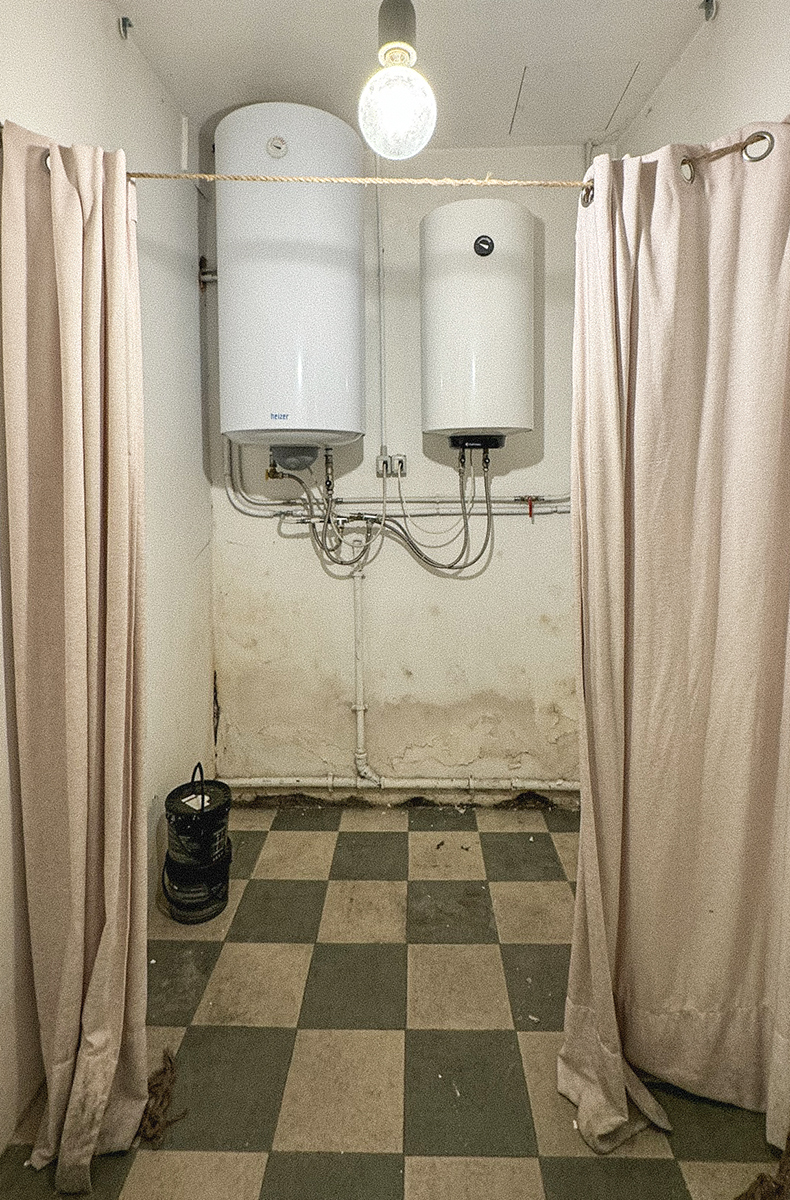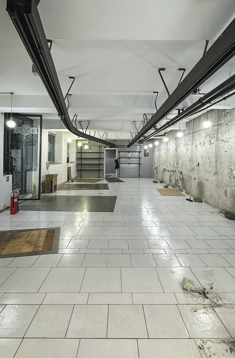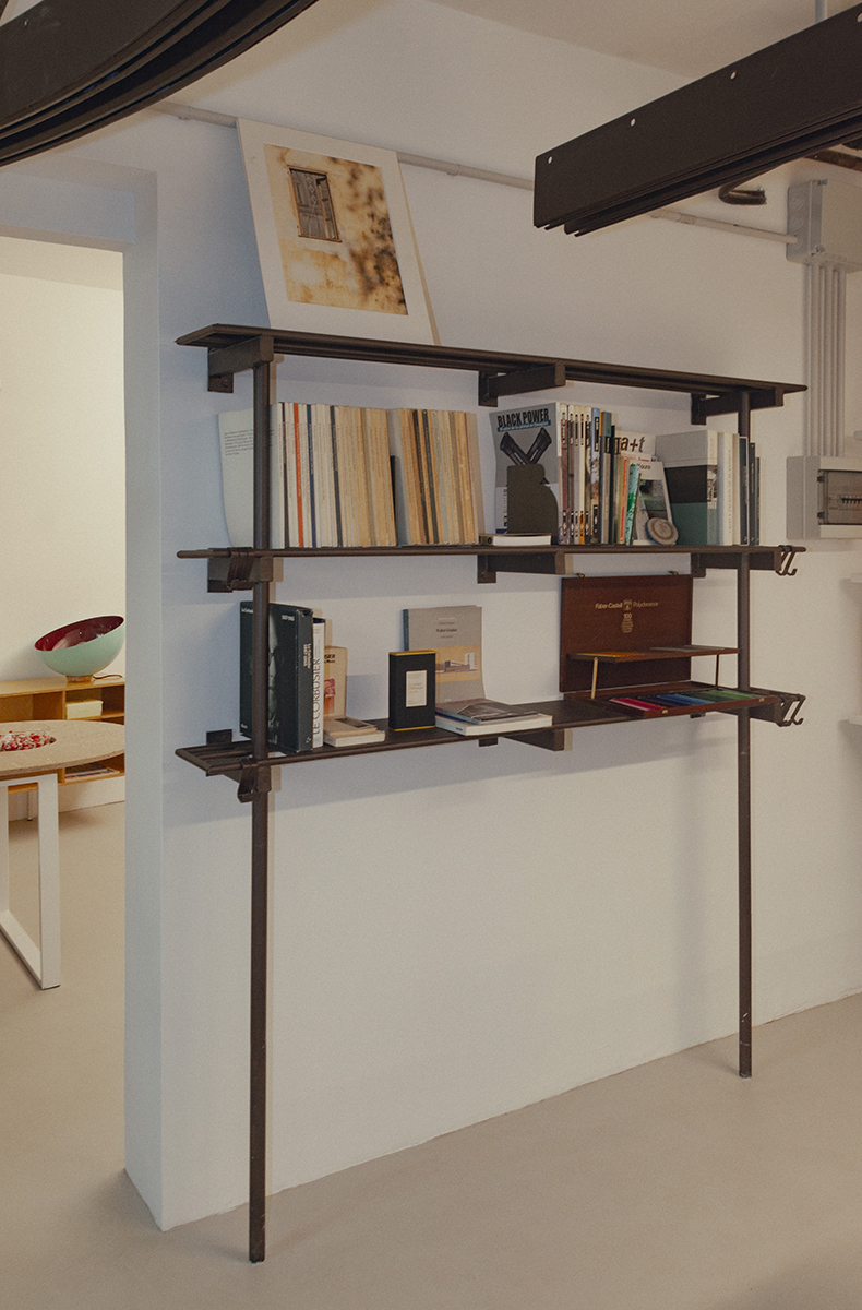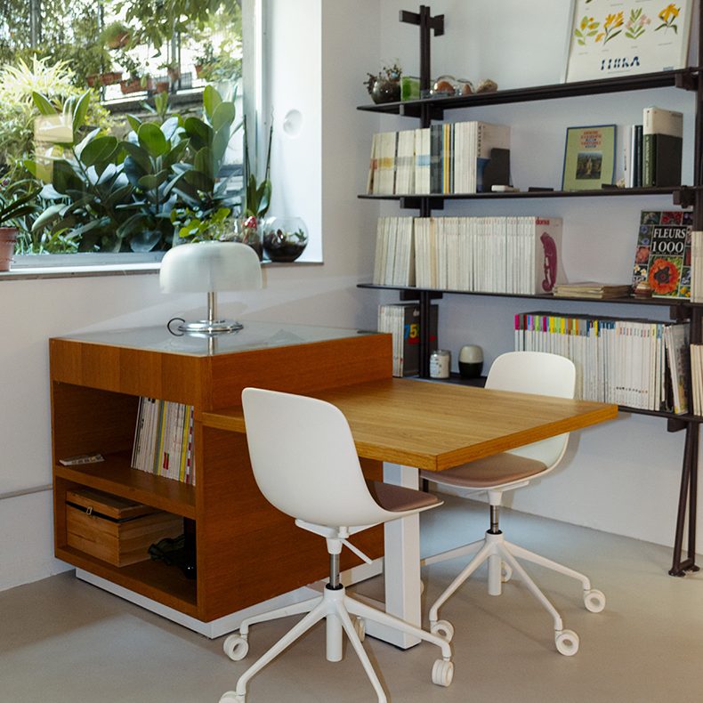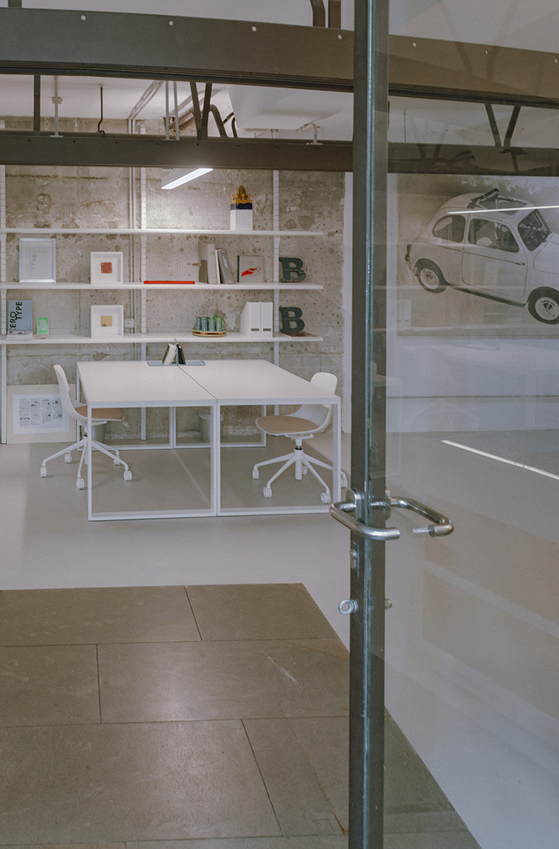 Lo spazio si trova all’interno di un cortile silenzioso, ma di in un’importante Via commerciale. Abbiamo voluto conservare un sistema di guide metalliche a doppio binario ancorate al plafone, pensate per questo luogo tanti anni fa, per uno spazio commerciale disegnato da noi. Un elemento fortemente caratterizzante, che ci consente di inserire delle tende filtro, posizionabili a seconda delle esigenze, appendere pannelli, immaginare un supporto per possibili mostre. Le scrivanie sono tavoli, anch’essi liberi di trovare nuove configurazione, tali da potersi unire, creando un unico tavolo lunghissimo o appaiare, costituendo isole di lavoro.